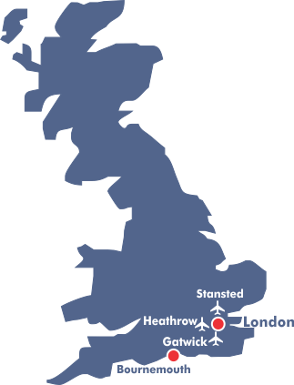 De nærmeste flyplassene er London Heathrow, Gatwick og Stansted.