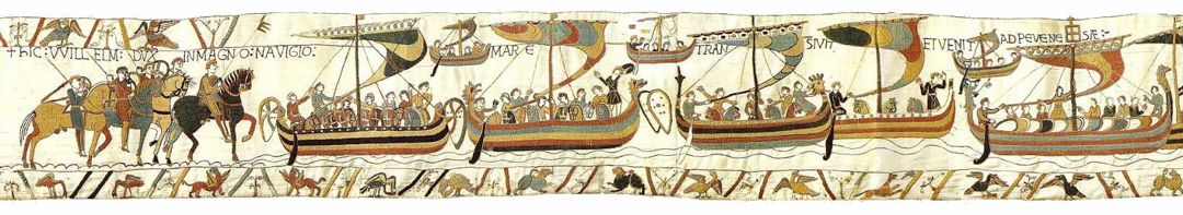 Slaget ved Hastings er "gjenskapt" på det berømte Bayeux veggteppet. Her ser vi Wilhelm Erobreren på vei over den engelske kanalen.