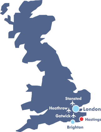 Hastings har ca. 90.000 innbyggere ligger i det syd-østre hjørnet av England i "fylket" East Sussex. De nærmeste flyplassene er London Gatwick og London Heathrow, men Stansted er heller ikke langt unna.