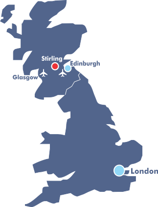 Stirling har ca. 46.000 innbyggere og ligger omtrent midt imellom storbyene Glasgow og Edinburgh, som begge har flyplasser for internasjonal trafikk.
