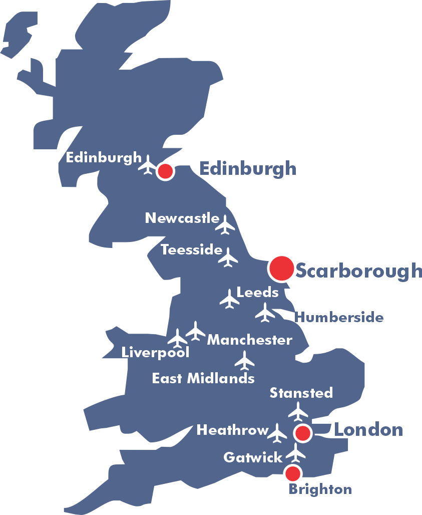 Reisen går som regel med egen buss og deretter ferge mellom Amsterdam og Newcastle som ligger nær Scarborough, eller Rotterdam - Hull.